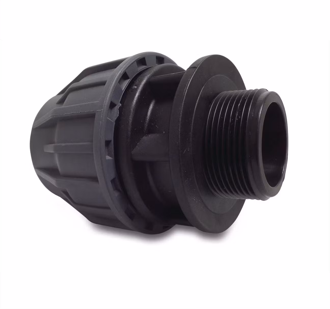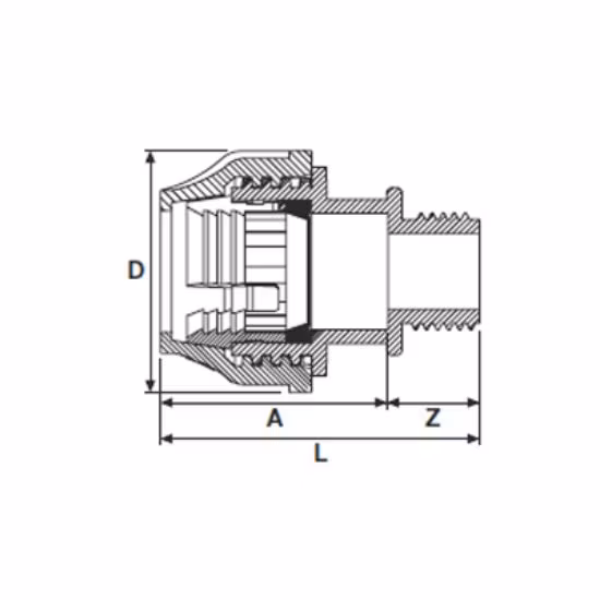 PEM/PP koppling övergång från Ø50 eller Ø63 mm rör/slang till utvändigt gängad anslutning R40 resp R50 (1,5 tum resp 2 tum). Gängtejp rekommenderas.